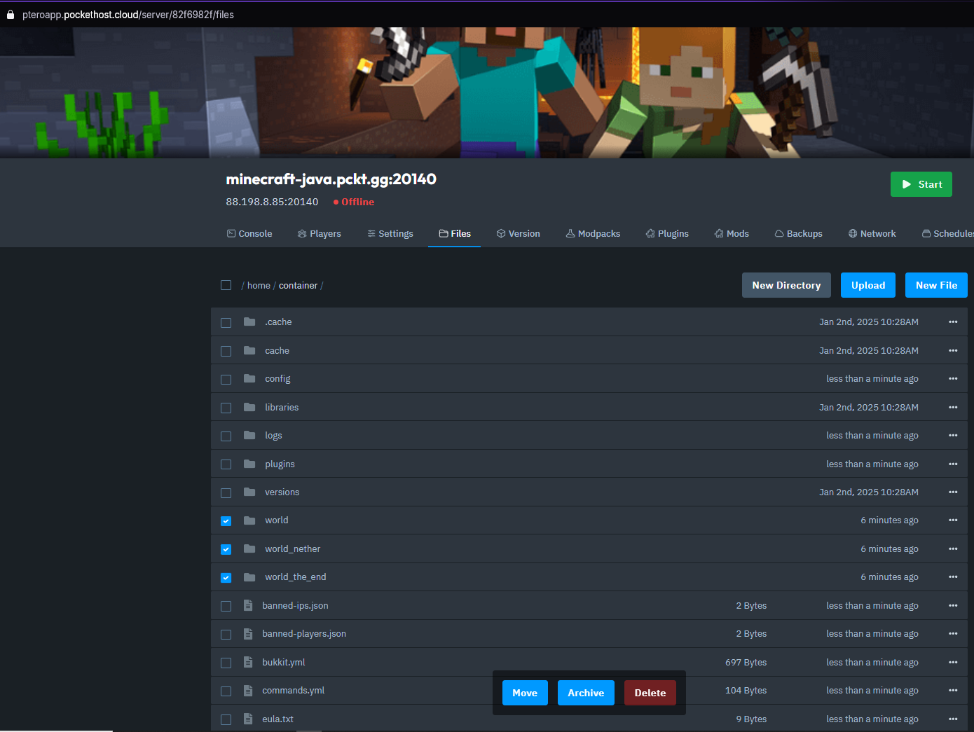 Before unarchiving your new world, you need to either delete or rename the existing world folders on your server. If you want to keep a backup, archive them first and then download the archive to your PC.
