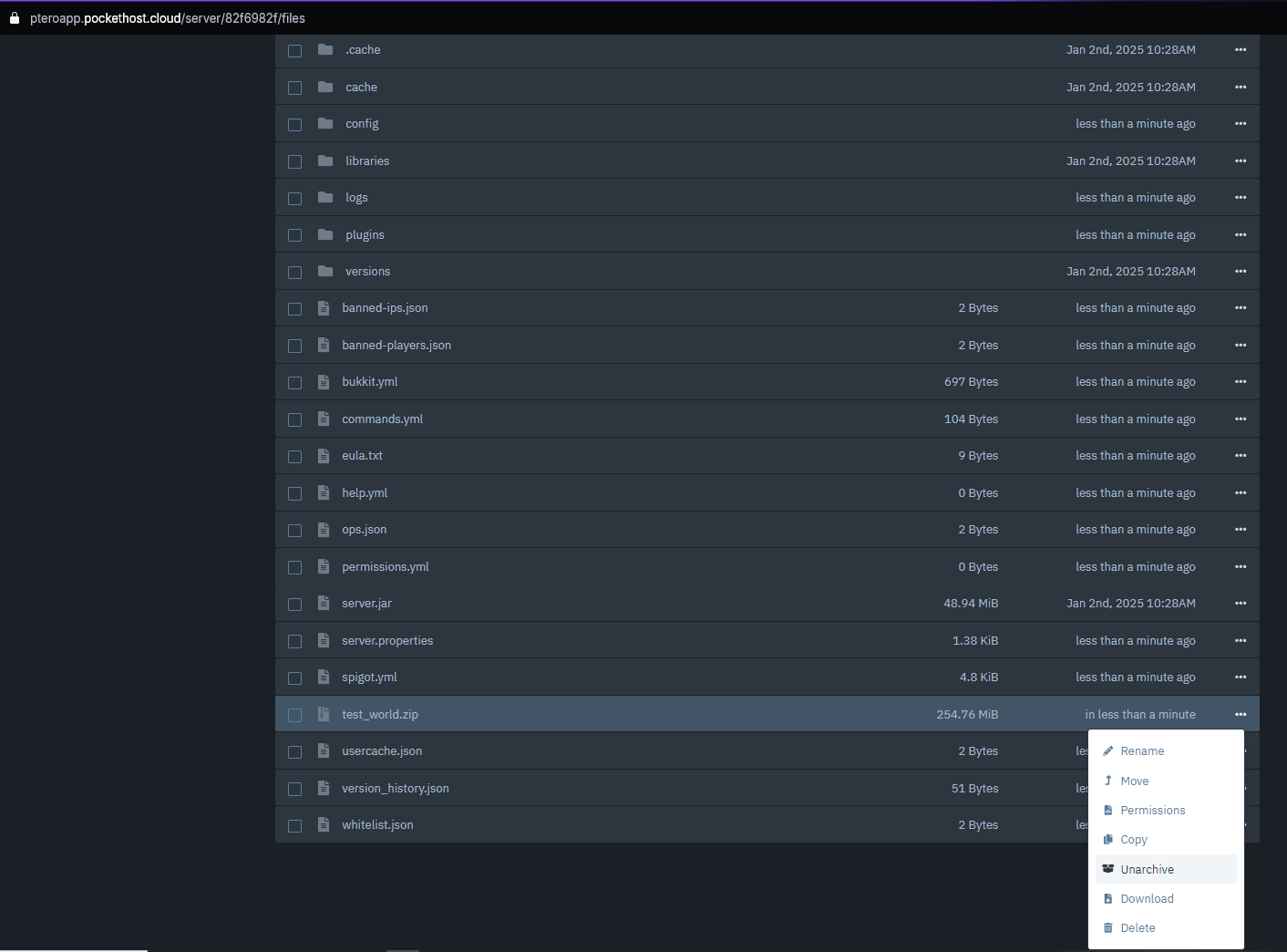 Once the .zip file is uploaded, use your server's control panel to unarchive (extract) the world folder. This will unpack your world files onto the server.