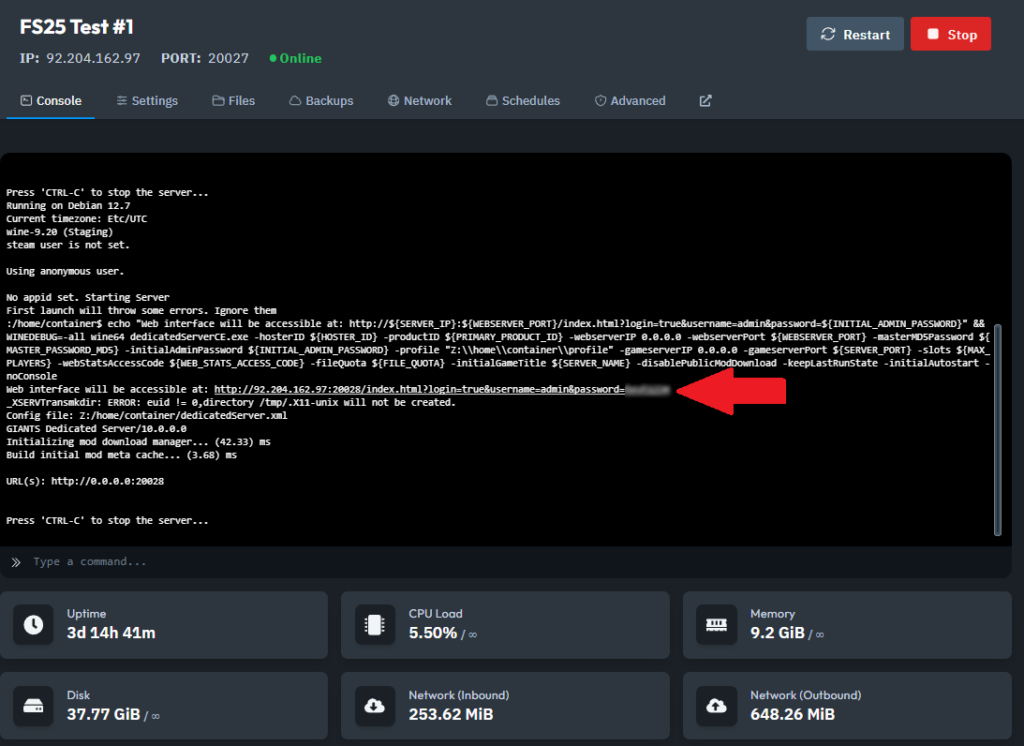 2. Open the Web Interface: Click the link that directs you to the Farming Simulator Web Interface or use the Go to Admin Panel button.