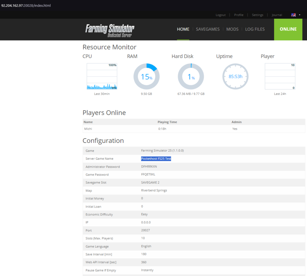 2. Open the Web Interface: Click the link that directs you to the Farming Simulator Web Interface or use the Go to Admin Panel button.
