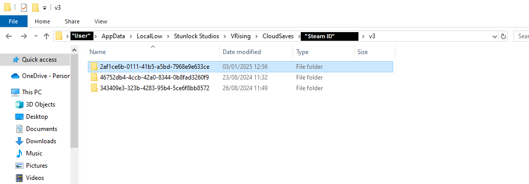 Cloud Save: Users\"User"\AppData\LocalLow\Stunlock Studios\VRising\CloudSaves\"Steam ID"\v3