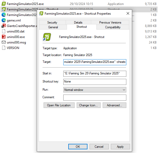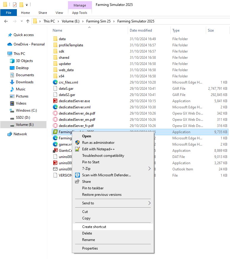 1. Abra sua Pasta do Farming Simulator 2025 e clique com o botão direito no FarmingSimulator2025.exe para criar um atalho